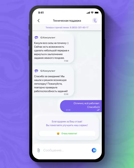 Подключенная техподдержка 24/7 (наш собственный call-центр) позволяет оперативно решать все возникающие вопросы как по работе системы — как в чате, так и на горячей линии.