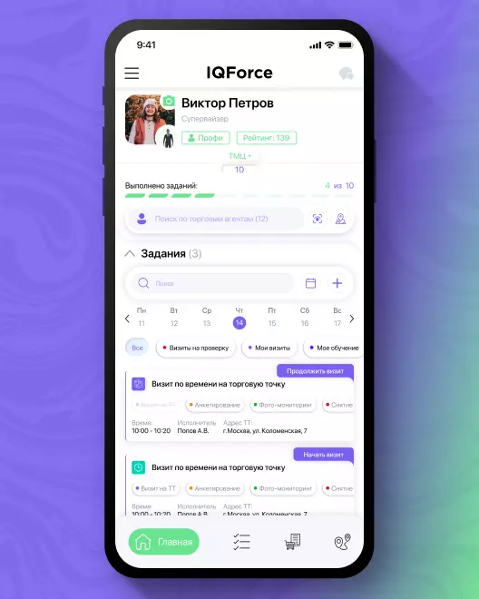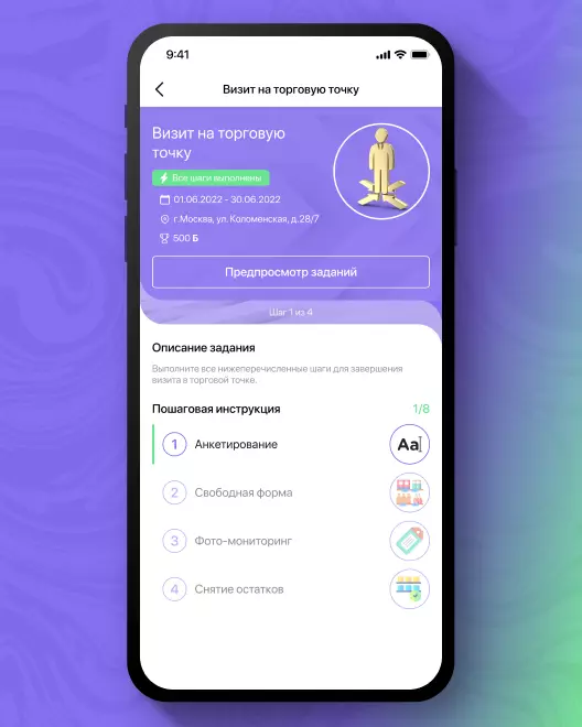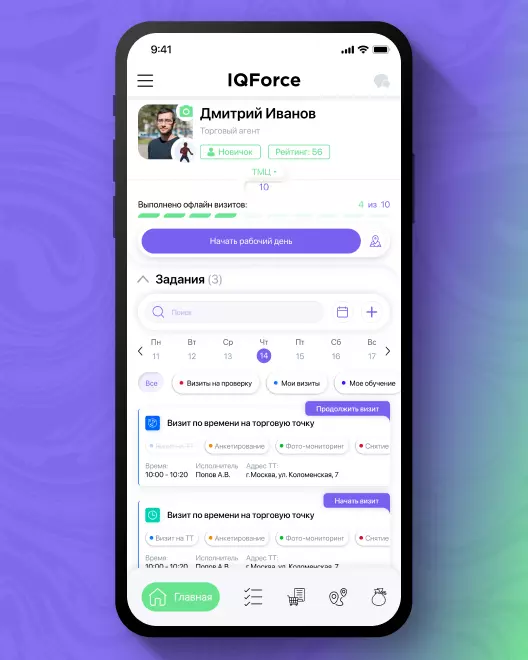 Благодаря работе в единой экосистема IQ Force + IQ Retail торговые точки видят действия торгового агента, запланированные в ближайший визит: оформление заказа, анкетирование, снятие остатков, обучение, мерчендайзинг и т. д., и могут самостоятельно выполнить эти задания за дополнительное вознаграждение.
