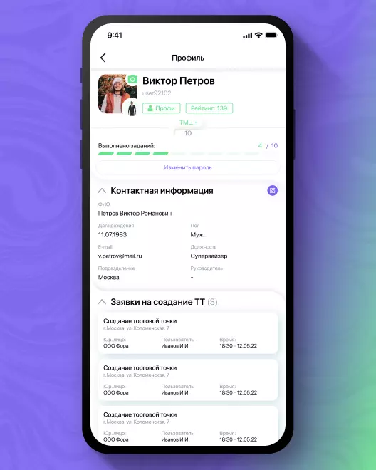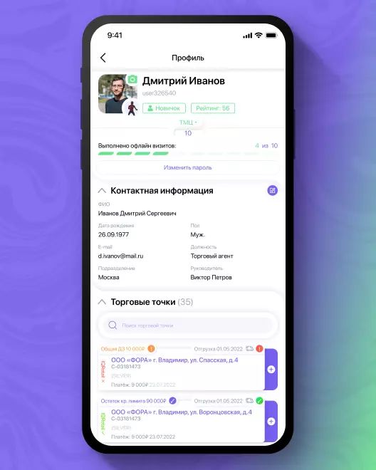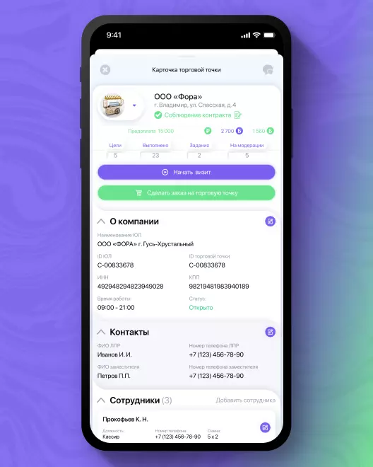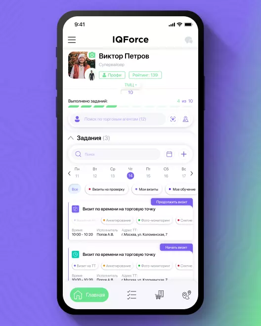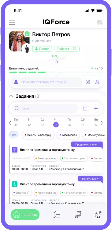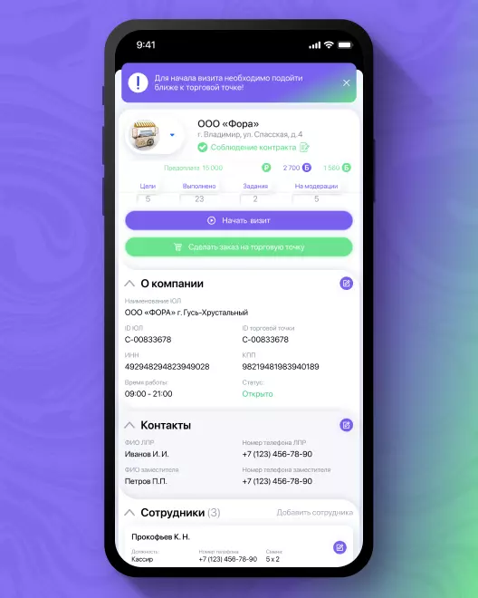 Фиксируем приход торгового агента в торговую точку по геолокации и автоматическое начало визита: система контролирует выполнение всех запланированных в рамках визита задач и собирает данные для статистики.