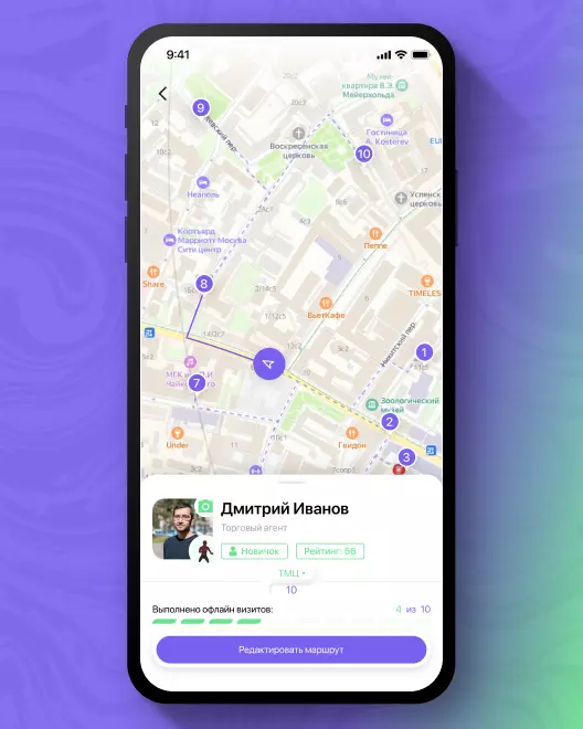 Динамические маршруты торговых агентов отображается на интерактивной карте как для самого сотрудника, так и для его супервайзера, имеющего возможность вручную вносить изменения в маршрут и контролировать местонахождение сотрудников и их перемещения в режиме онлайн.