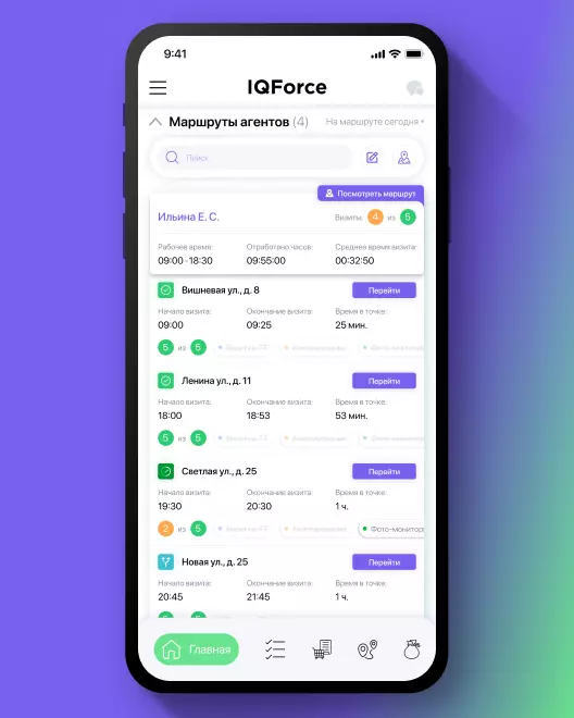 В отличие от устаревшего подхода к составлению маршрутных листов заранее на месяц/квартал, IQ Force ежедневно выстраивает оптимальные маршруты для торговых агентов на основе того, насколько хорошо торговые точки делают заказы и выполняют задания, автоматически внося изменения и перемещая тайм-слоты, если сотрудники магазина берут на себя задачи торгового агента, запланированные на время визита.