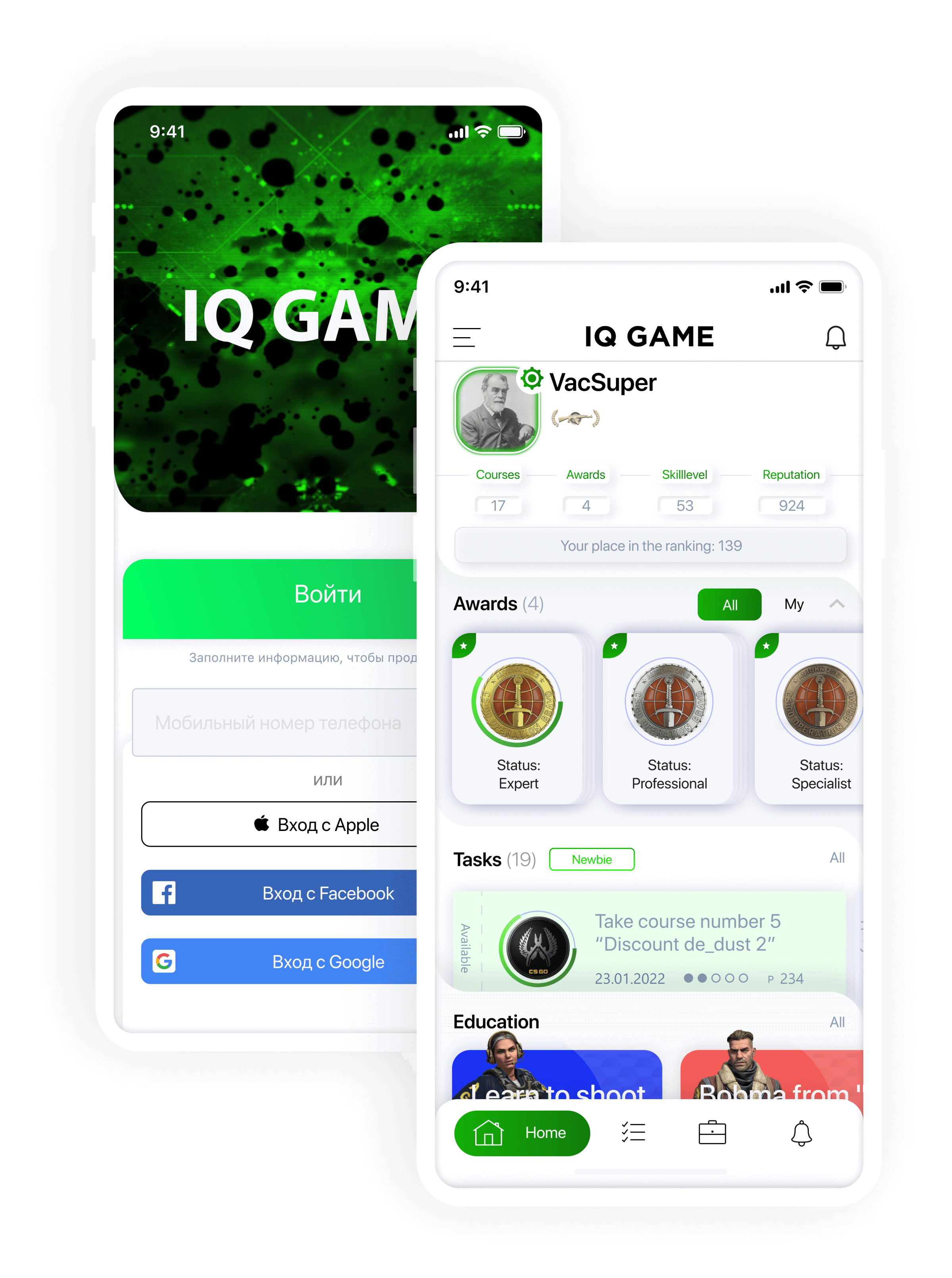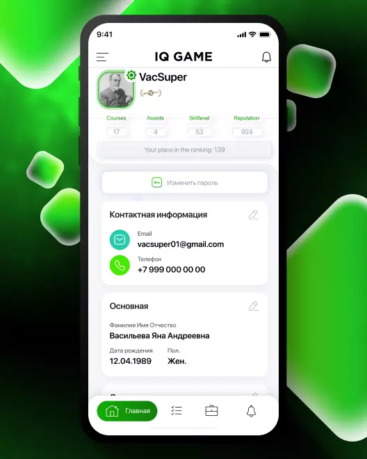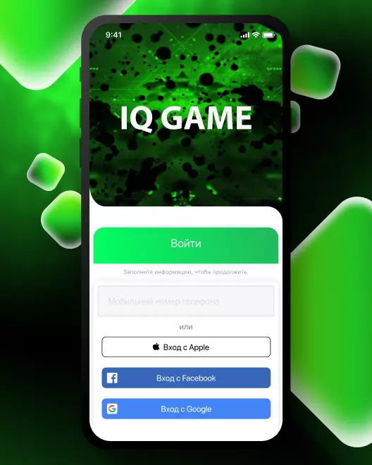 Пользователь регистрируется в веб-сервисе IQ GAME по номеру мобильного телефона или через соц. сети.