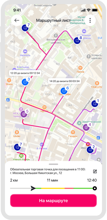 • Отображение точек для посещений / доставки на маршруте сотрудника