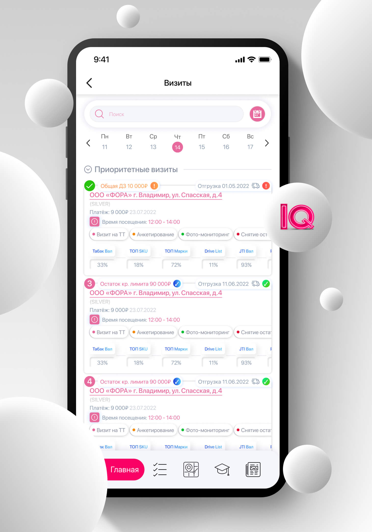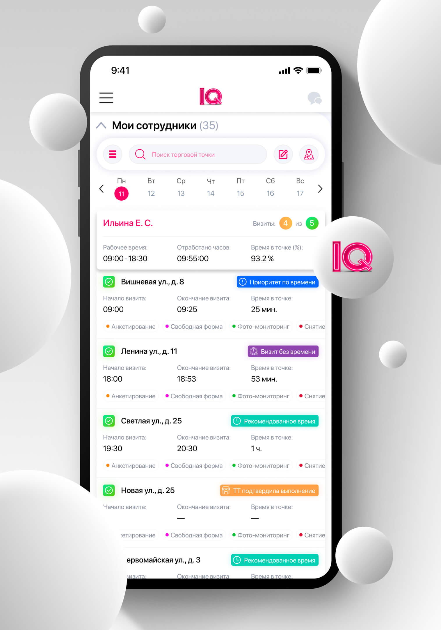 Модуль позволяет контролировать и приводить к единым стандартам работу сотрудников, совершающих перемещения в течение дня. IQ Geo Tracking зафиксирует приход сотрудника в необходимую локацию, автоматически подсчитает длительность каждого визита, предложит заполнить чек-листы по необходимому набору действий на объекте, а также отобразит на карте передвижения сотрудника в течение дня.