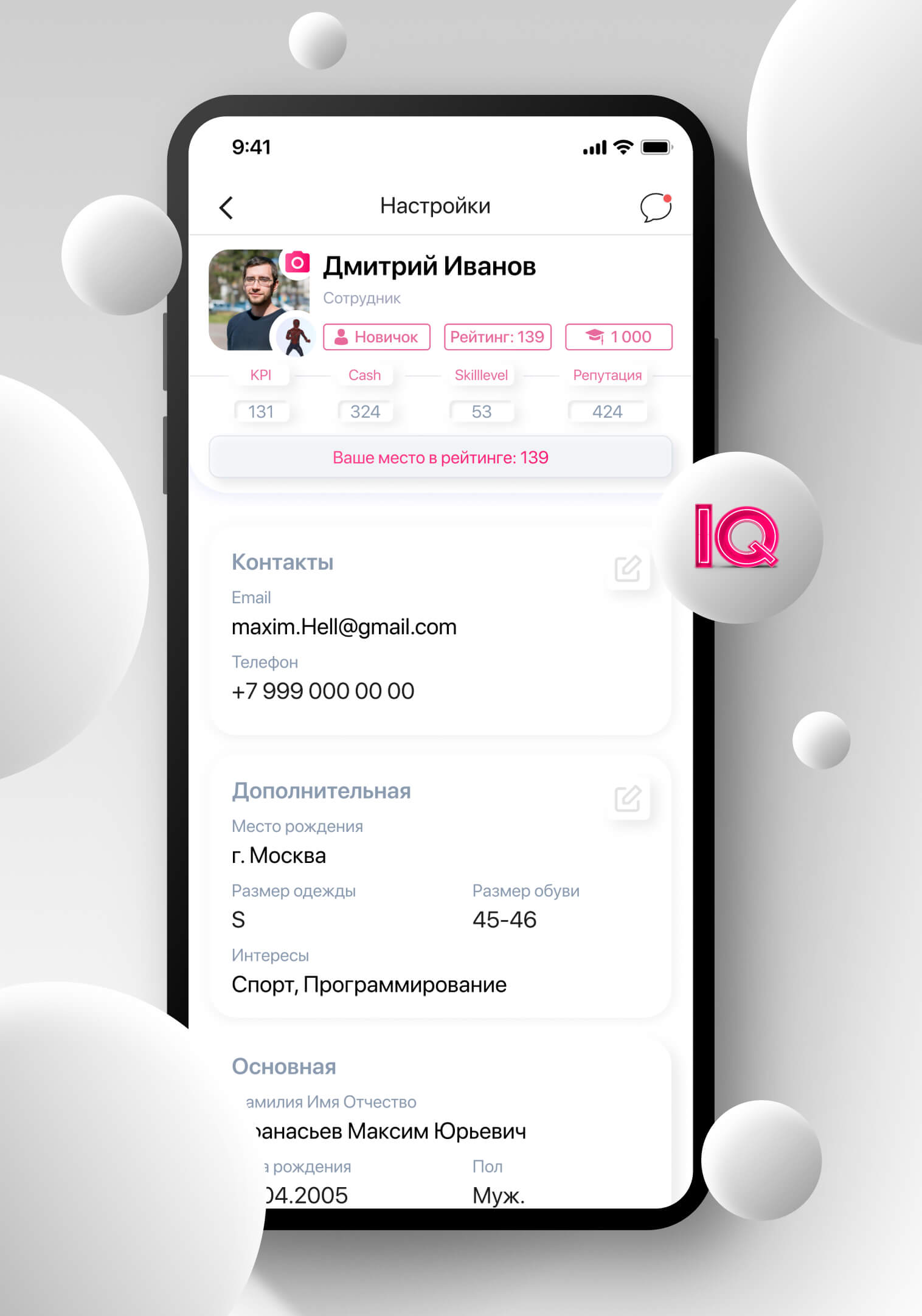 • Основная информация: фамилия, имя, отчество, дата рождения, пол, почта, должность, подразделение, руководитель
