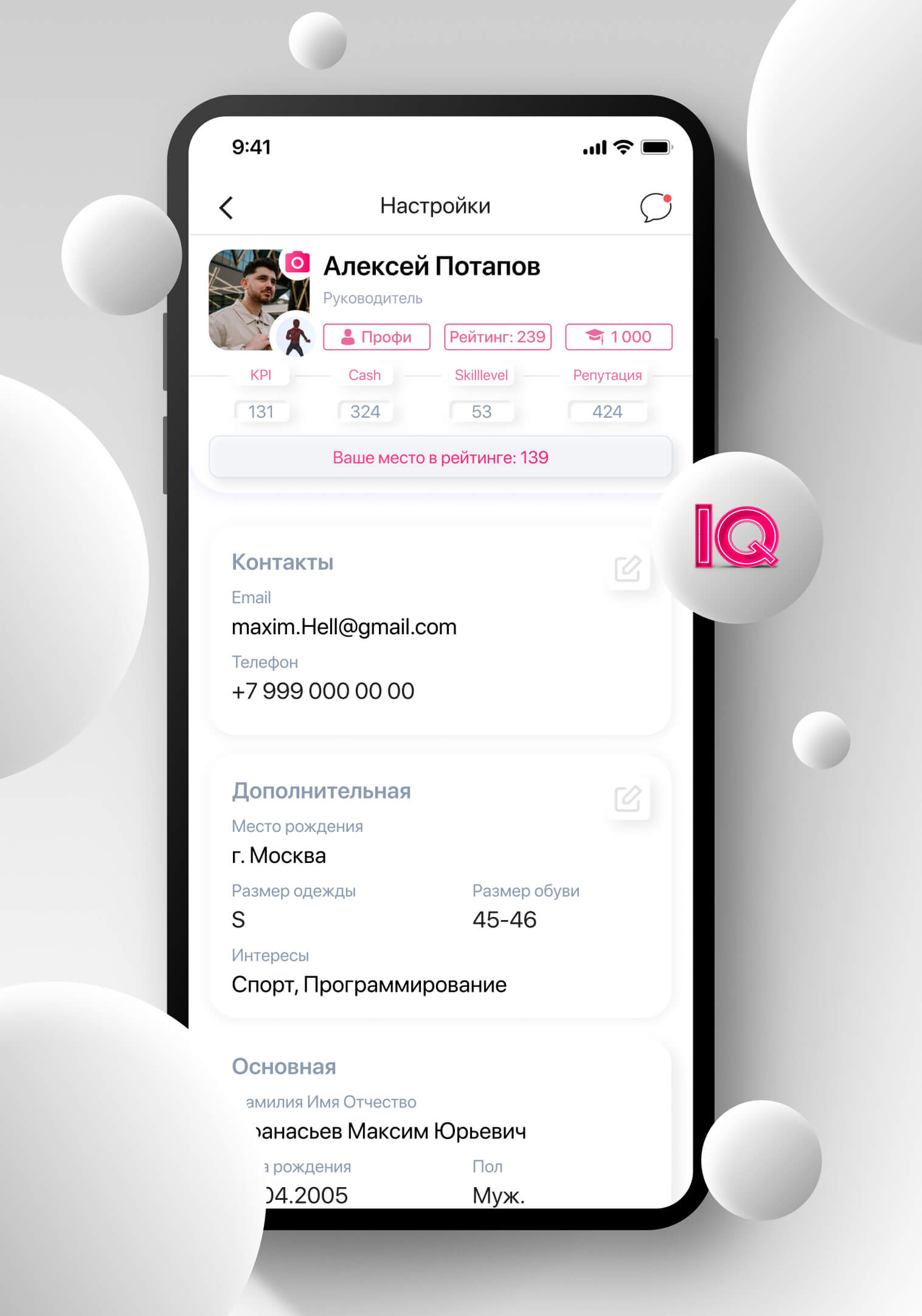 • Основная информация: фамилия, имя, отчество, дата рождения, пол, почта, компания