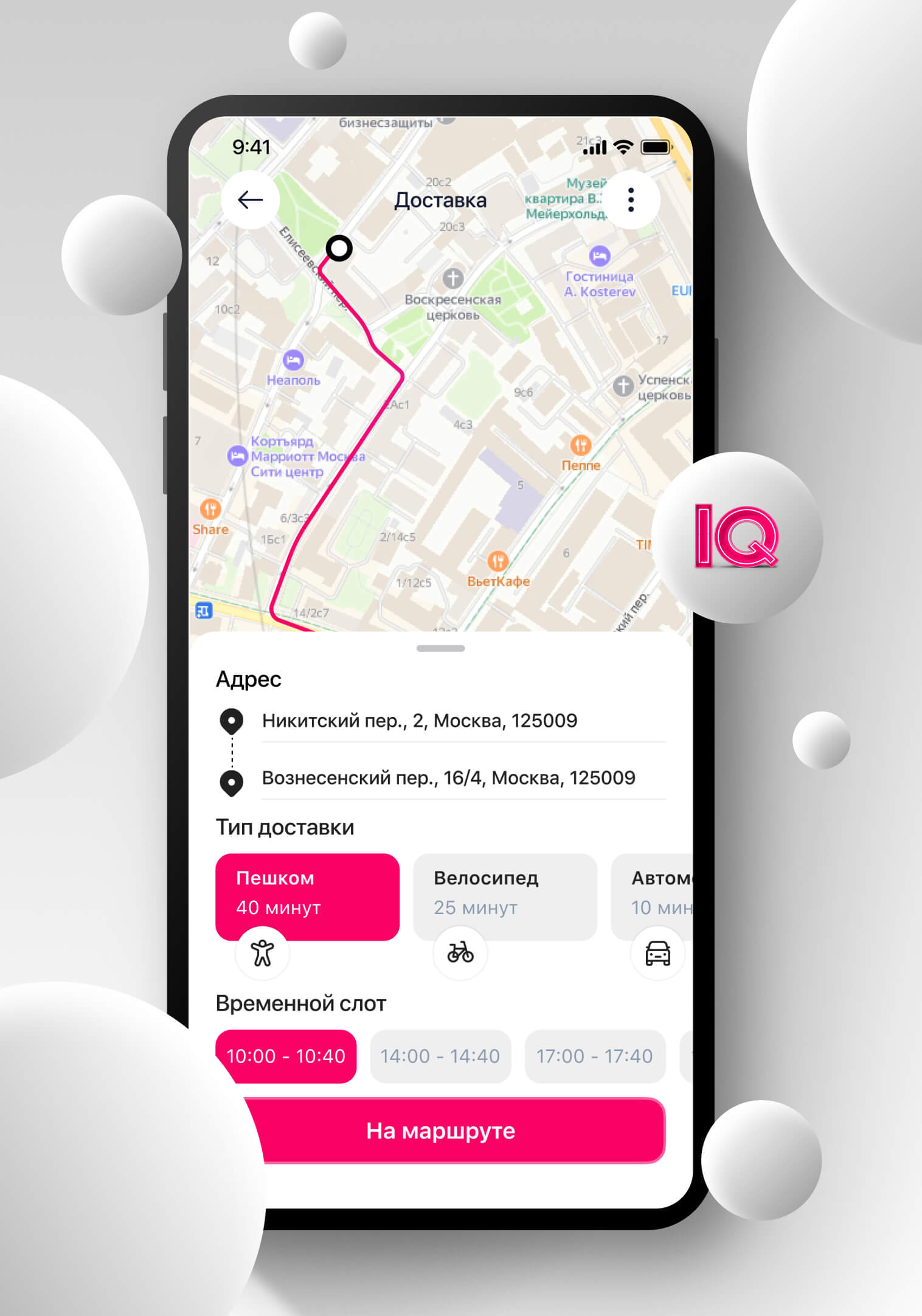 Выстраивание маршрутов доставки с учётом адресов клиентов и доступных тайм-слотов, а также текущей дорожной ситуации. Прокладывание маршрутов во встроенном навигаторе и отображение передвижений на карте в режиме реального времени — как для руководства, так и для клиентов.