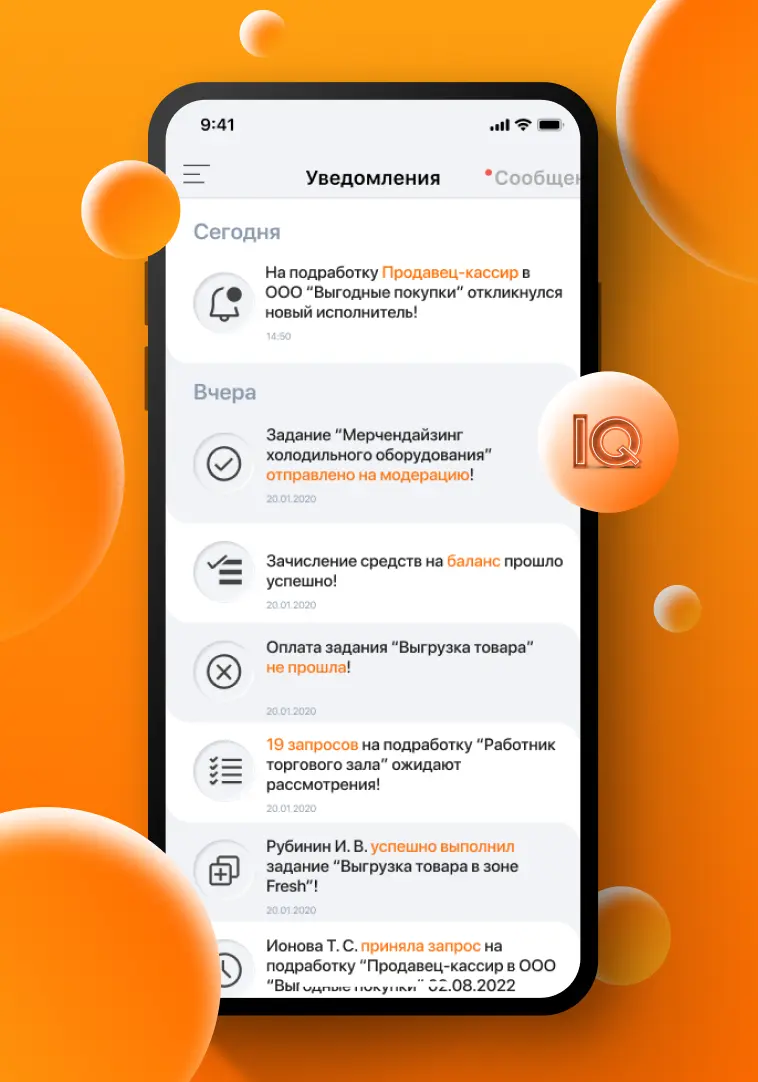 Робот-помощник созванивается с лучшим кандидатом из откликнувшихся на подработку или из общей базы IQ JOB и сторонних сервисов, а также отправляет push-уведомление в приложении и сообщение в мессенджер с описанием подработки, временем и часовой ставкой, получает подтверждение готовности приступить к задаче, а также автоматически напоминает о задании за 2 часа до его начала.