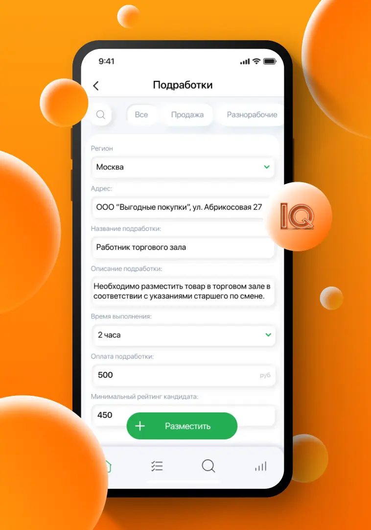 Сконструированная подработка размещается на платформе IQ JOB и рассылается по базе потенциальных исполнителей, а также по другим подключенным ресурсам.