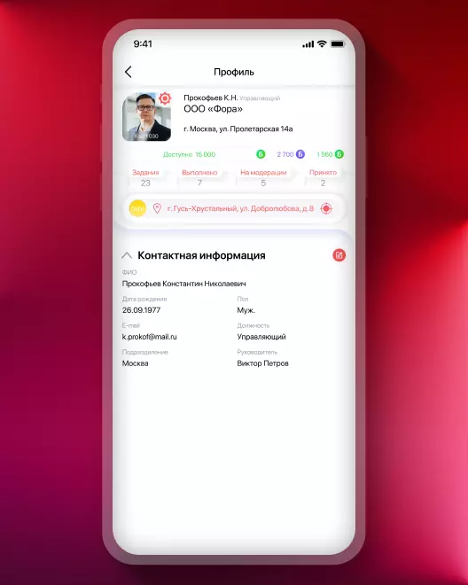 • Basic information: last name, first name, patronymic, date of birth, gender, mail, position, department, manager